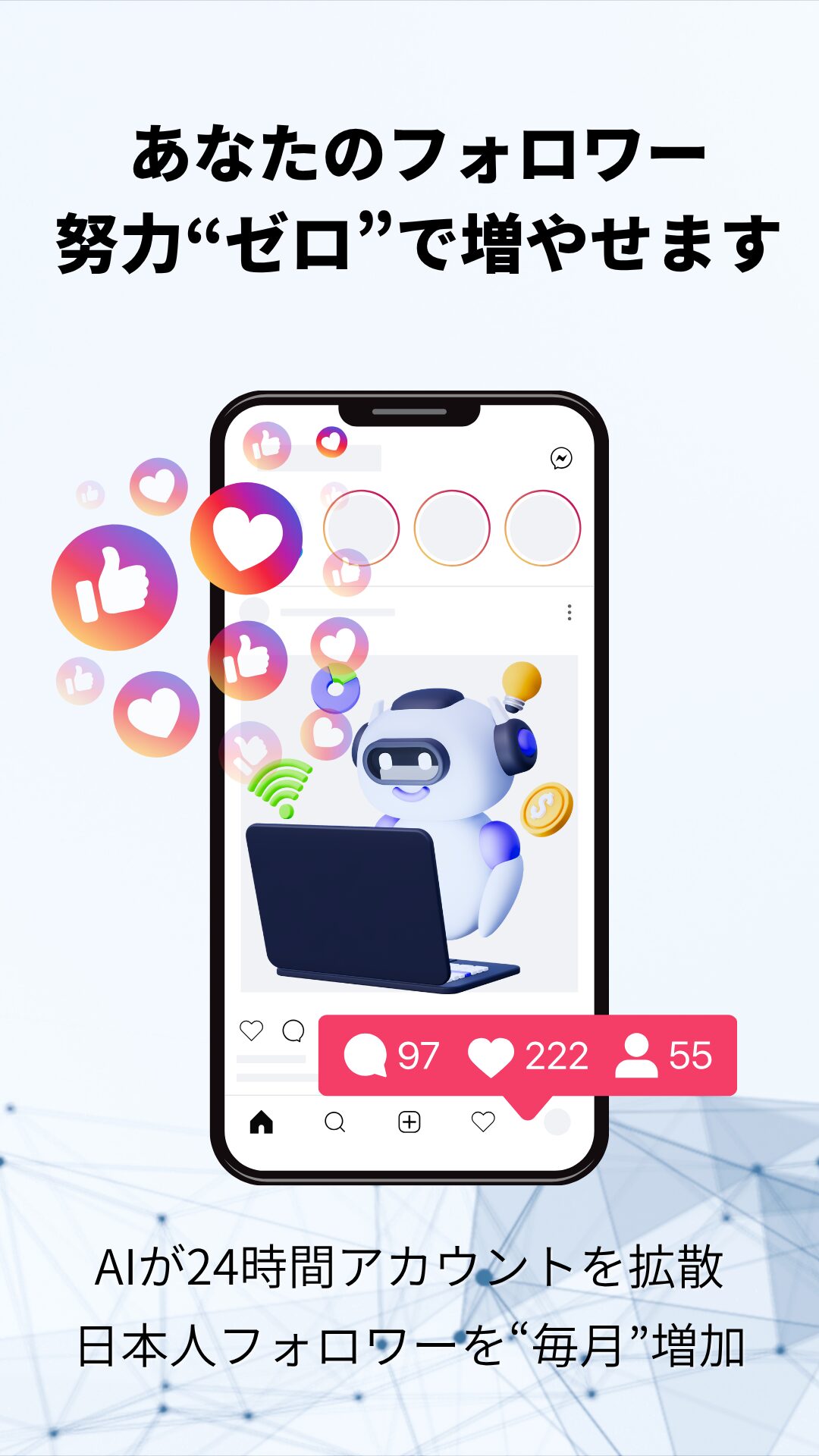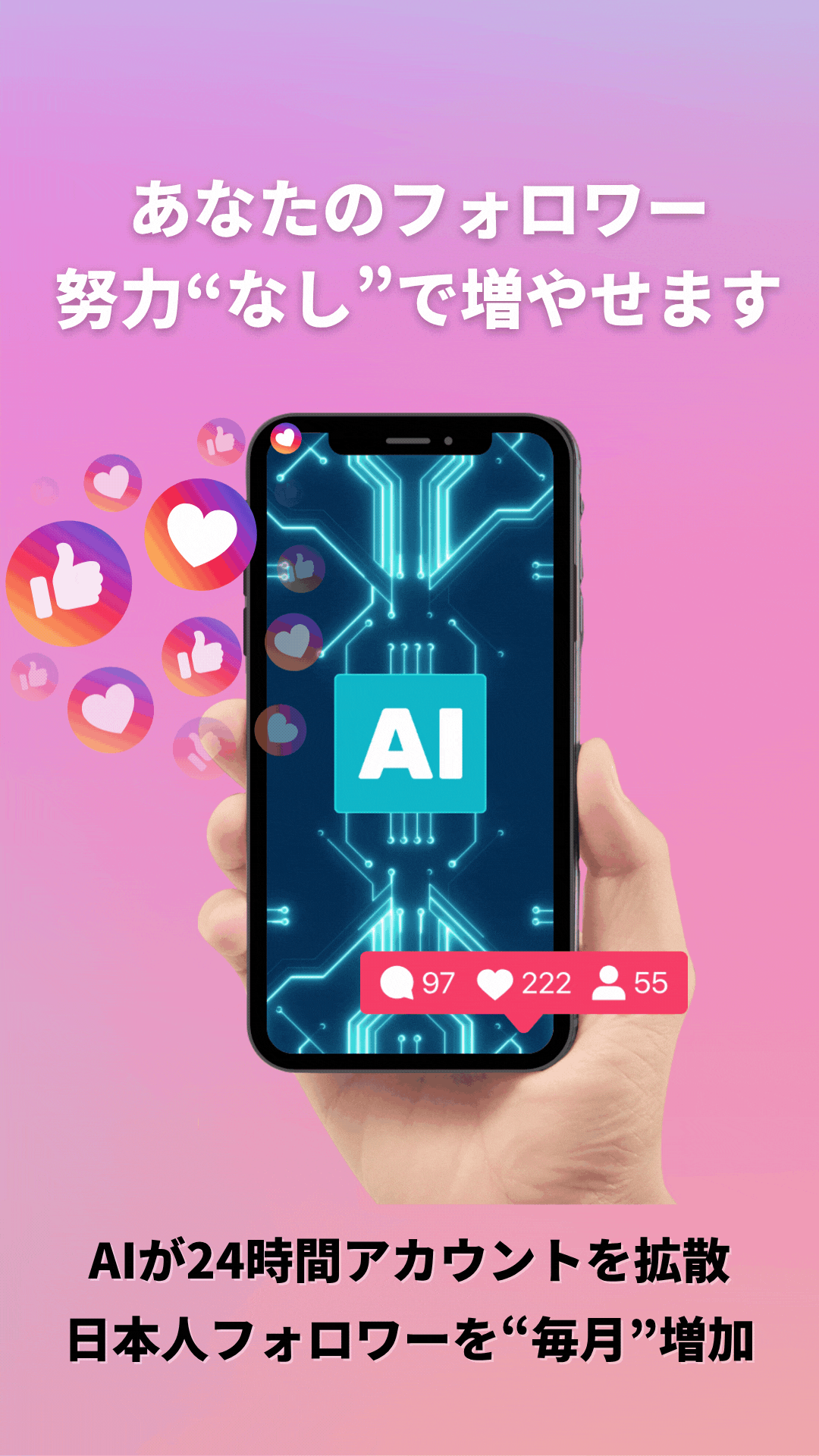 あなたはいつも通りインスタを使っているだけで、フォロワーが自然に増えていきます。