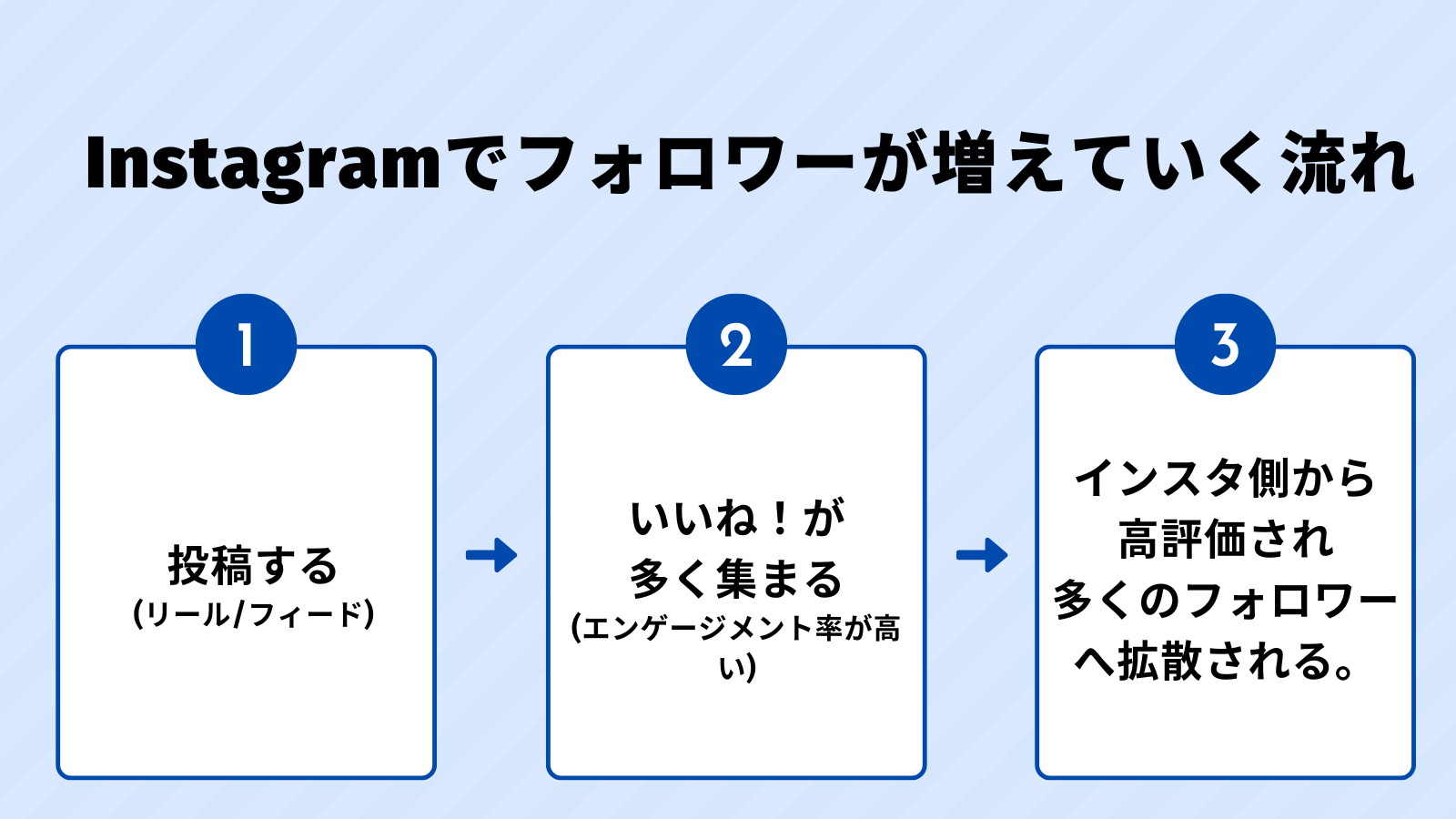つまりフォロワーを増やしながら、あなたの投稿へのいいね数などが高い状態をつくり出すことができれば、あなたのアカウントはインスタグラム側から見てもいいアカウントだと見做されていく可能性が高いのです。