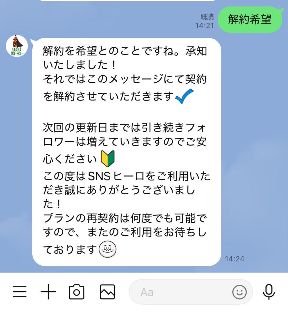 ・解約の縛りは一切ありません。LINEから「解約希望」とメッセージを送れば翌月以降の更新がストップされます。